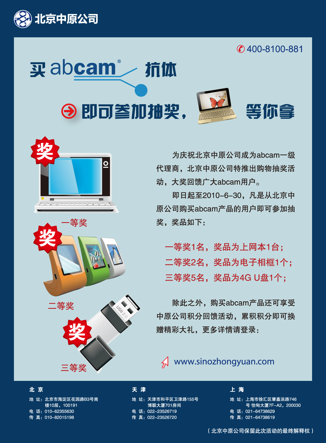 為慶祝北京中原公司成為abcam一級代理商,特推出購物抽獎活動(dòng)回饋廣大用戶(hù)。 10-08-13