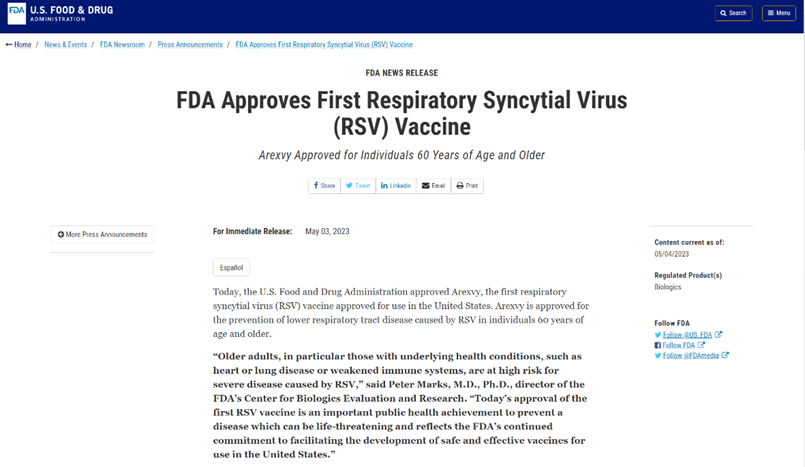 2023年5月3日,葛蘭素史克(GSK)宣布其呼吸道合胞病毒(Human respiratory syncytial virus,RSV)疫苗Arexvy獲美國食品藥品監督管理局(FDA)批準上市,用于60歲及以上老年人群預防RSV感染導致的下呼吸道疾?。≧SV-LRTD) 該產(chǎn)品也是全球首款獲批上市的RSV疫苗。23-06-09