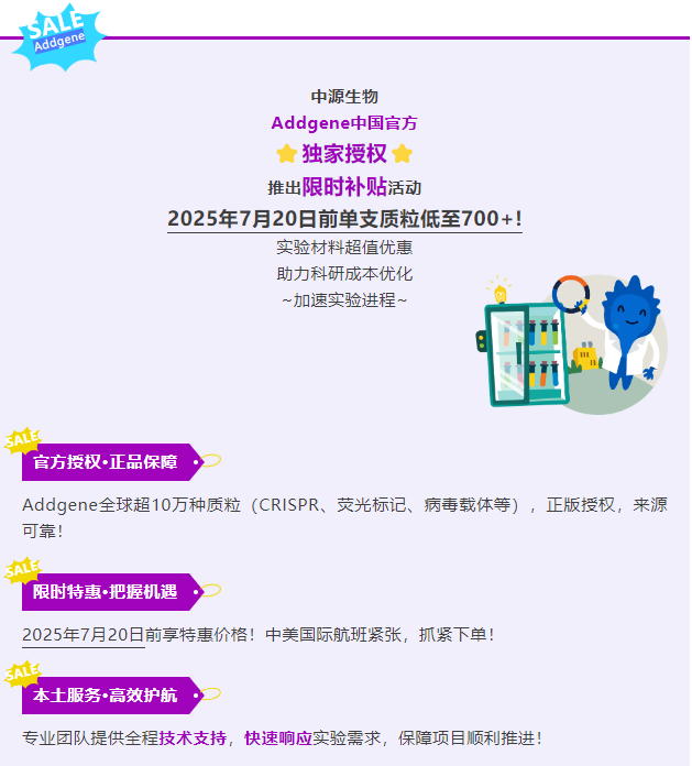 中源生物 Addgene中國官方 ?獨家授權? 推出限時(shí)補貼活動(dòng) 2025年7月20日前單支質(zhì)粒低至700+!實(shí)驗材料超值優(yōu)惠 助力科研成本...25-05-16
