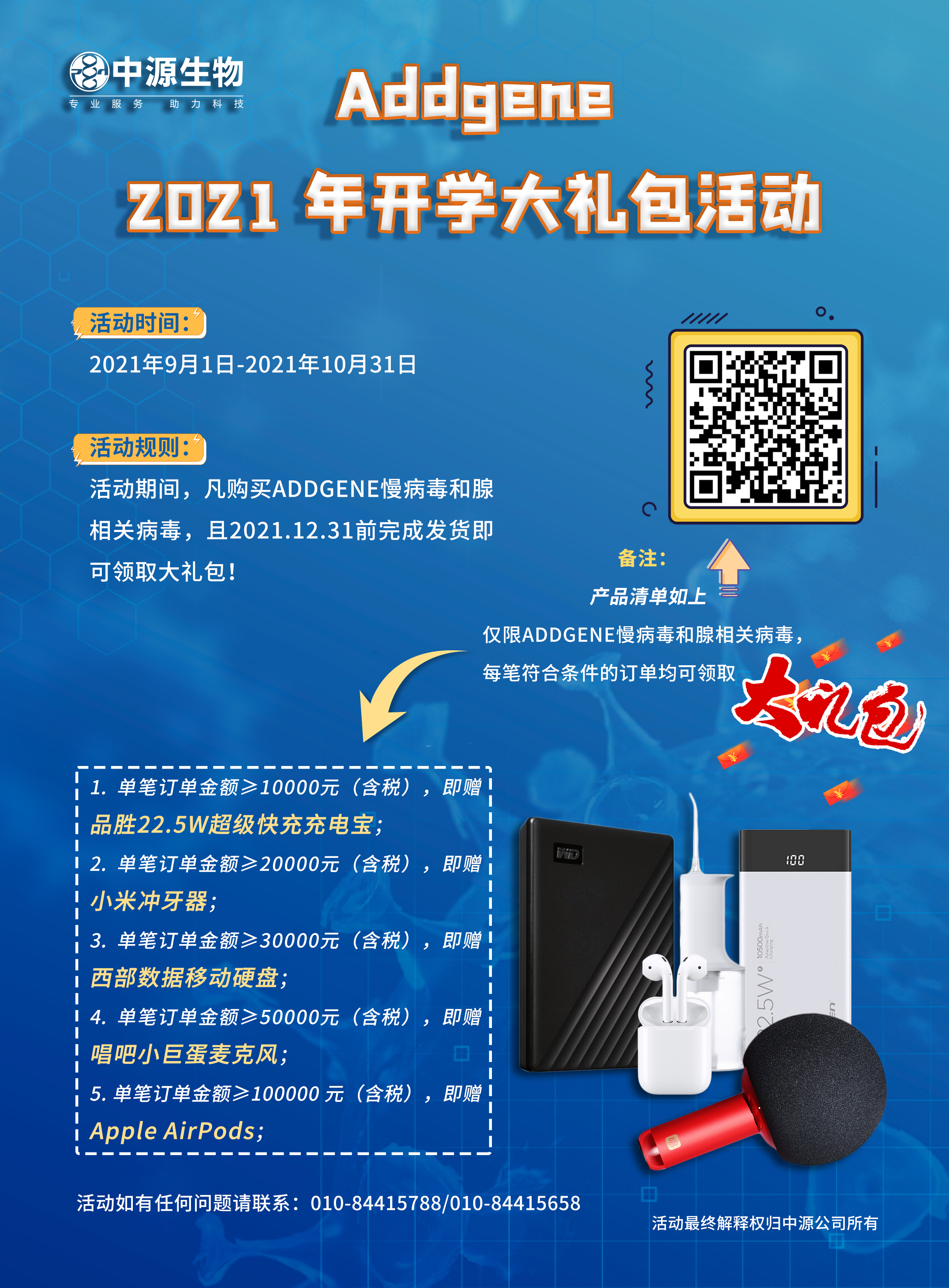 又到一年開(kāi)學(xué)季 Addgene送福利啦! 凡購買(mǎi)病毒產(chǎn)品 滿(mǎn)額即獲贈相應禮品 過(guò)期不候哦! 21-09-01