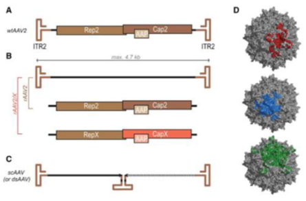 目前臨床研究中采用的重組腺相關(guān)病毒載體(Recombination adeno-associated virus, rAAV)是在非致病的野生型AAV基礎上改造而成的基因載體。利用rAAV可以將外源基因轉入動(dòng)物組織和細胞中,由于其種類(lèi)多樣、免疫原性極低、安全性高、宿主細胞范圍廣、擴散能力強、體內表達基因時(shí)間長(cháng)等,rAAV被視為最有前途的基因研究和基因治療載體之一。