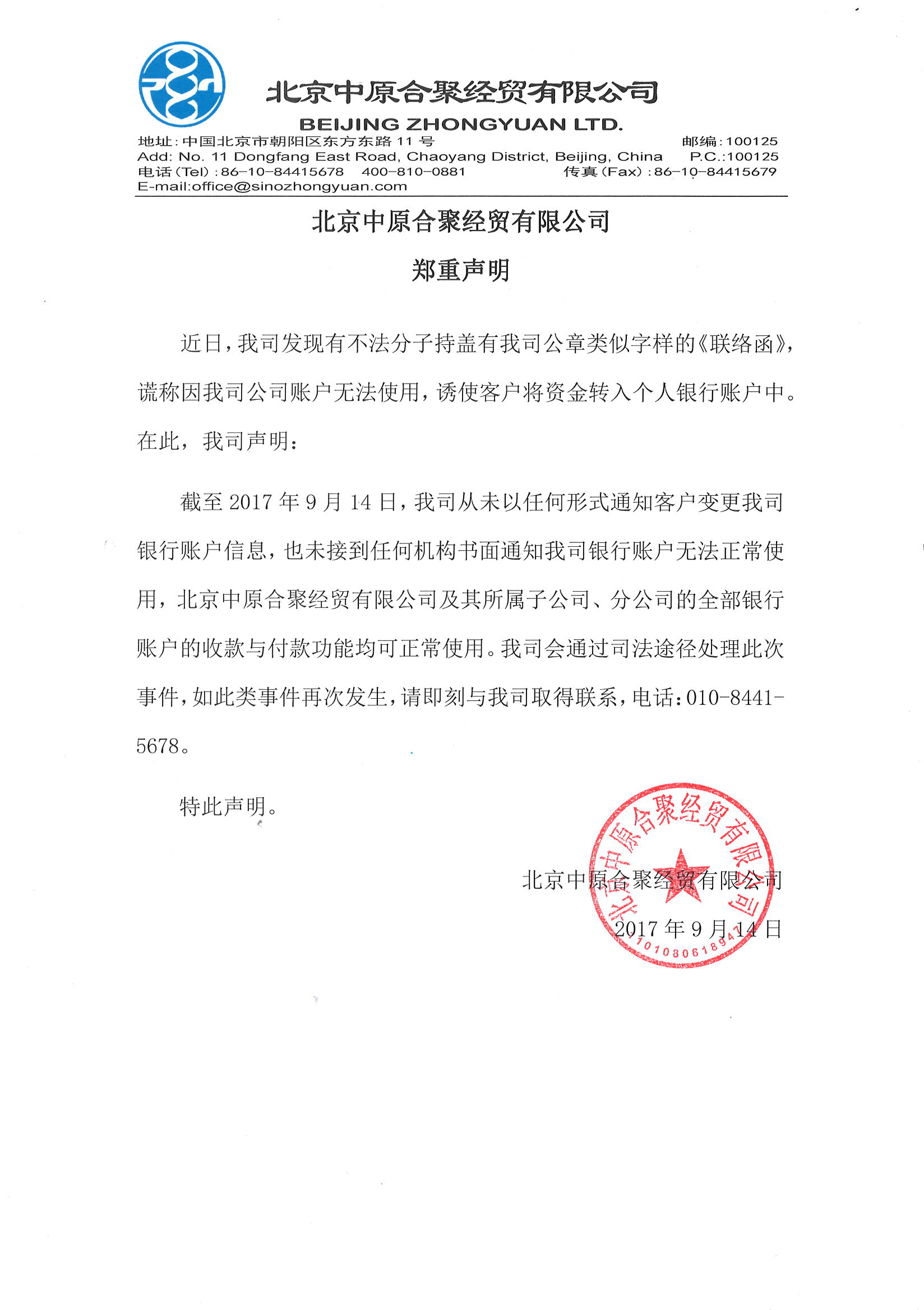 北京中原合聚經(jīng)貿有限公司鄭重聲明