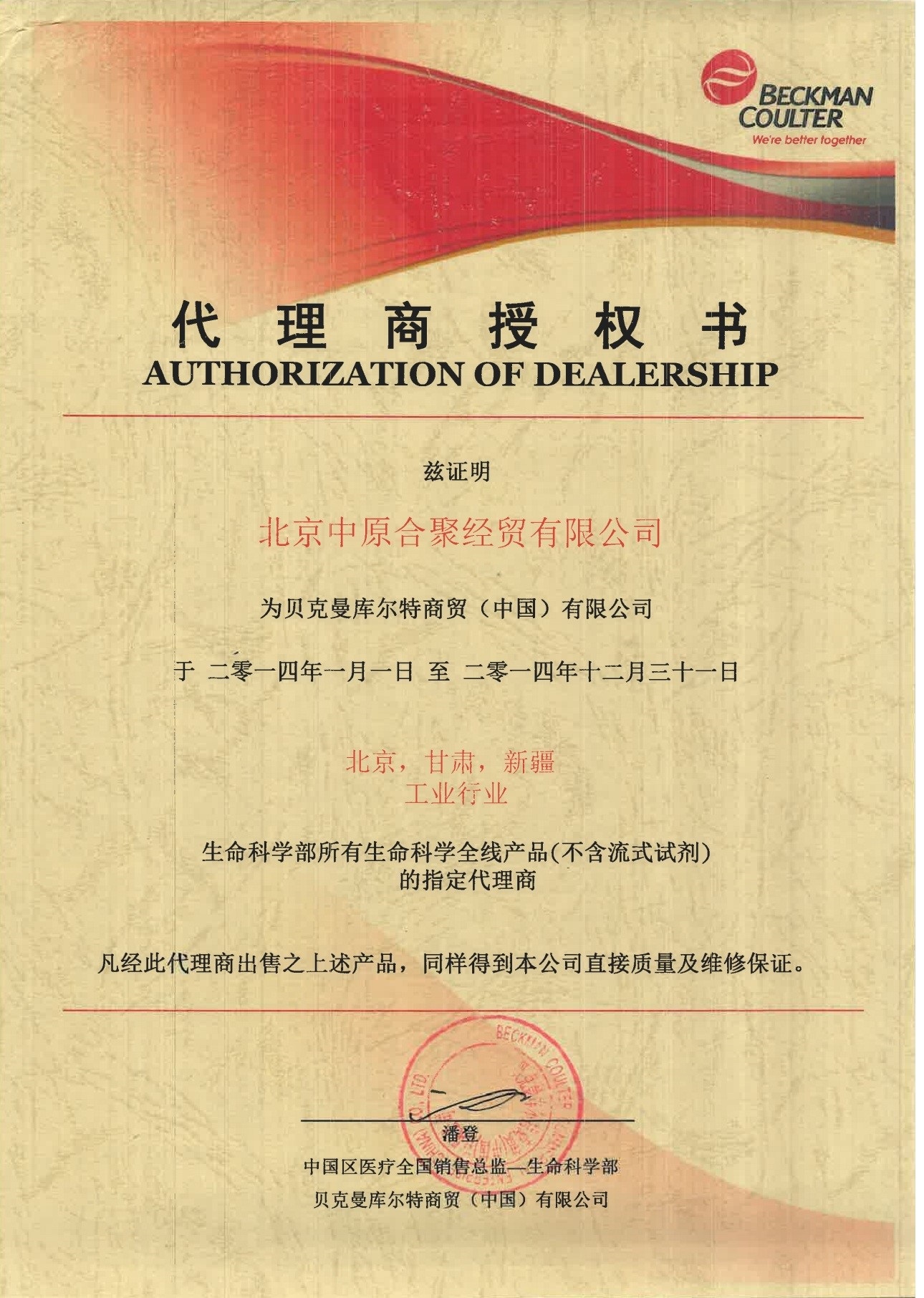 2014年1月1日,北京中原公司正式成為美國B(niǎo)ECKMAN COULTER公司在中國北京、甘肅和新疆工業(yè)行業(yè)的指定代理商。