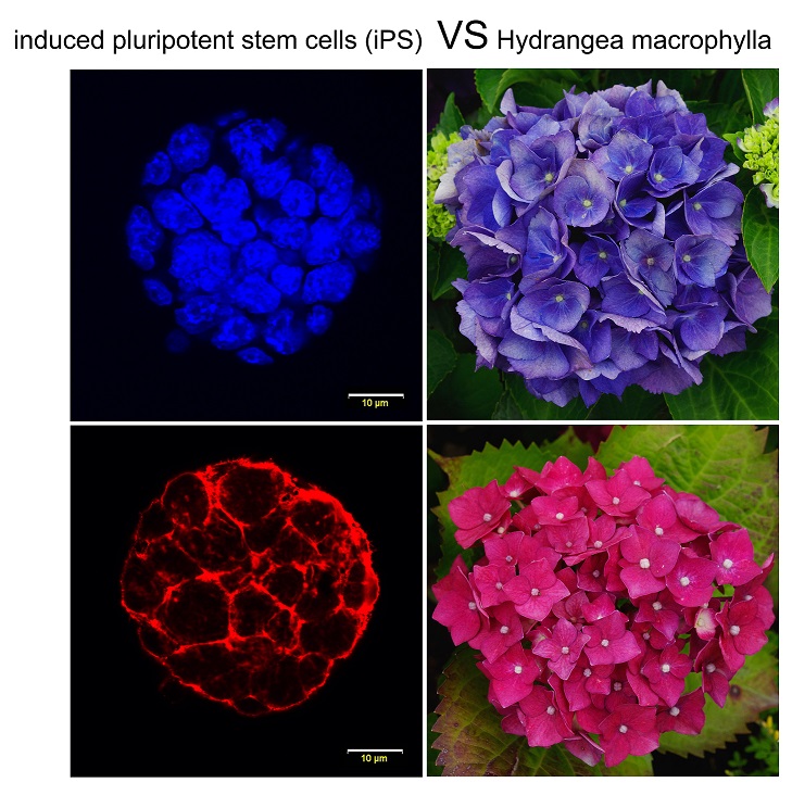 “異曲同工:從細胞水平誘導多能干細胞(ipsc)到個(gè)體水平八仙花,生命的巧合讓我們嘆為觀(guān)止!左:ips克隆hoechst,SSEA1染色,Olympus FV10i,右:八仙花 PENTAX K-r 。”