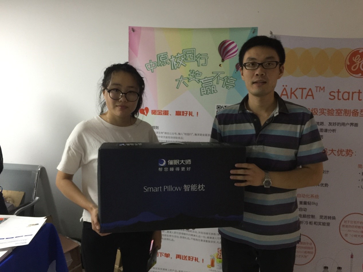 此次“中原校園行”活動(dòng)我們準備了豐富的禮品。最后,一等獎——智能記憶枕,由天津大學(xué)生命科學(xué)學(xué)院的一位老師抽出。