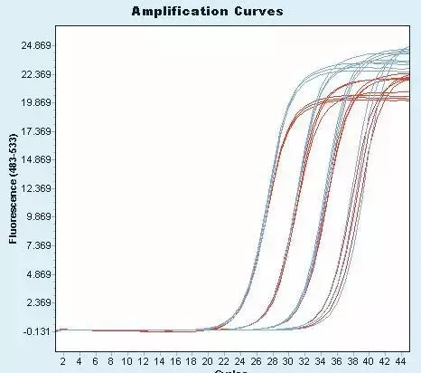 人類(lèi)DNA目標序列按10倍梯度稀釋?zhuān)?0,000 - 10拷貝/孔,3次重復),PCR反應配置完成后,立即上機反應(相應結果曲線(xiàn)為藍色),或在自動(dòng)上樣裝置中放置24小時(shí)后再上機反應(相應結果曲線(xiàn)為紅色)。兩種樣本的擴增曲線(xiàn)及相應Cp值說(shuō)明:熱啟動(dòng)酶預混反應液的性能不會(huì )被延長(cháng)的放置時(shí)間所影響
