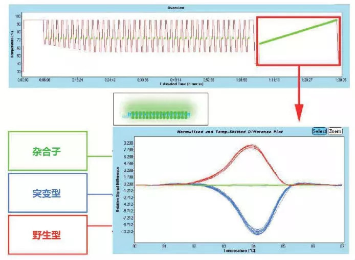 通過(guò)對儀器生成的高分辨率熔解數據進(jìn)行歸一化和溫度平移處理,結合可由用戶(hù)選擇的差異顯示圖,可以非??陀^(guān)地判斷一批樣本中不同的基因型的數量。