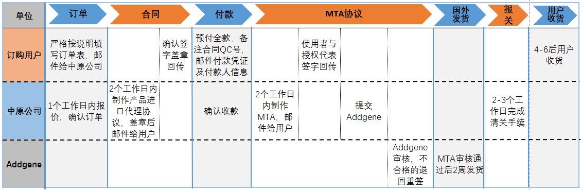 注意:《Addgene產(chǎn)品代理進(jìn)口協(xié)議》、英文MTA均簽署回傳,且已經(jīng)查到您的付款,才會(huì )給ADDGENE下單。僅提供了《Addgene產(chǎn)品訂單表》不表示已經(jīng)下單了。