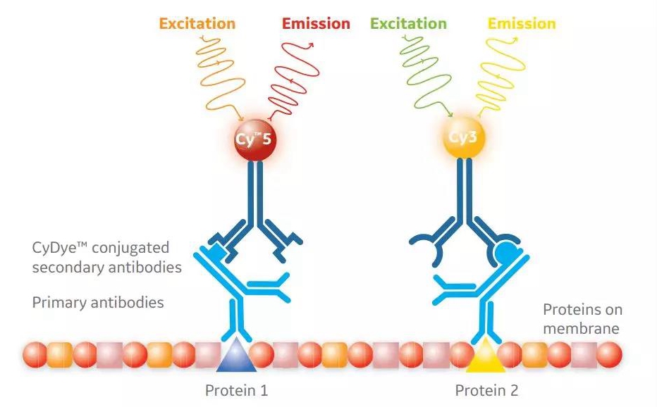 熒光二抗用起來(lái)就非常方便了,二抗上直接帶標記,所以直接拿去曝光顯色,一張膜可以同時(shí)雜兩個(gè)抗體,不用為內參而裁膜的感覺(jué)真好。