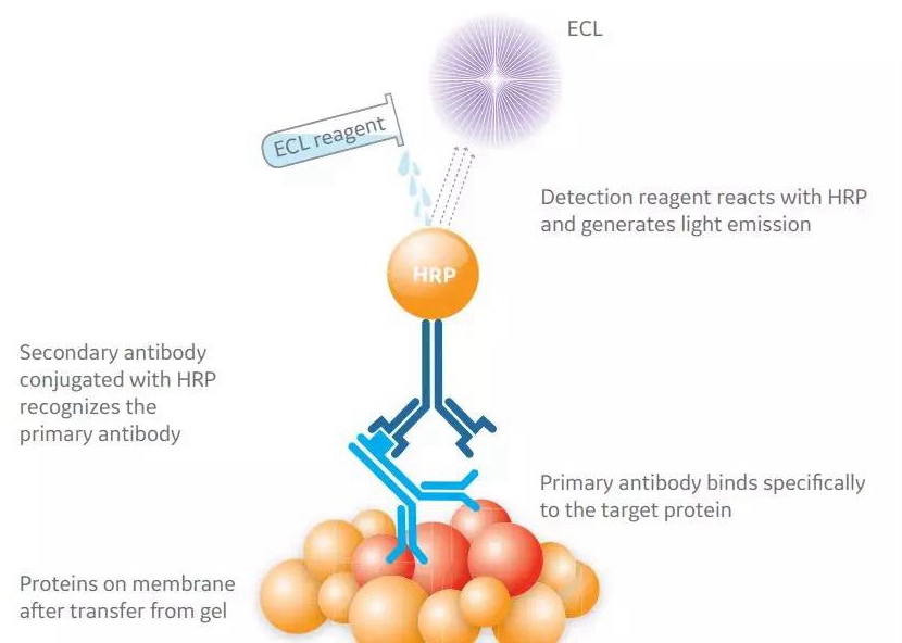 HRP標記時(shí)顯色多用ECL試劑,即底物魯米諾和過(guò)氧化氫,HRP催化魯米諾產(chǎn)生多步氧化反應,使之從基態(tài)躍升至激發(fā)態(tài)并伴隨產(chǎn)生428nm的低強度發(fā)射光,可以利用CCD或膠片進(jìn)行檢測,ECL檢測靈敏度極高,目前多個(gè)廠(chǎng)商正在挑戰fg級別。另外有小伙伴會(huì )問(wèn)DAB也可用于HRP標記的顯色,為什么應用在Western里面很少呢?盡管DAB顯色可以產(chǎn)生棕紅色的可見(jiàn)條帶非常利于觀(guān)察,但是DAB顯色靈敏度較低,對底物的量要求在500pg以上,所以多用于組化顯色。還有一種AP堿性磷酸酶標記的二抗多用BCIP/NBT試劑盒進(jìn)行顯色,BCIP在堿性磷酸酶的作用下水解,水解產(chǎn)物和NBT發(fā)生反應產(chǎn)生肉眼可見(jiàn)的不溶物,形成有顏色條帶,加水后可以終止反應(小編依然清楚的記得第一次做AP顯色看到條帶時(shí)激動(dòng)的拿著(zhù)洗瓶揮舞的自我),BCIP/NBT顯色靈敏度在100pg左右。這下知道為什么大多的客戶(hù)都選擇ECL顯色了吧,畢竟高豐度的蛋白沒(méi)那么多哦。