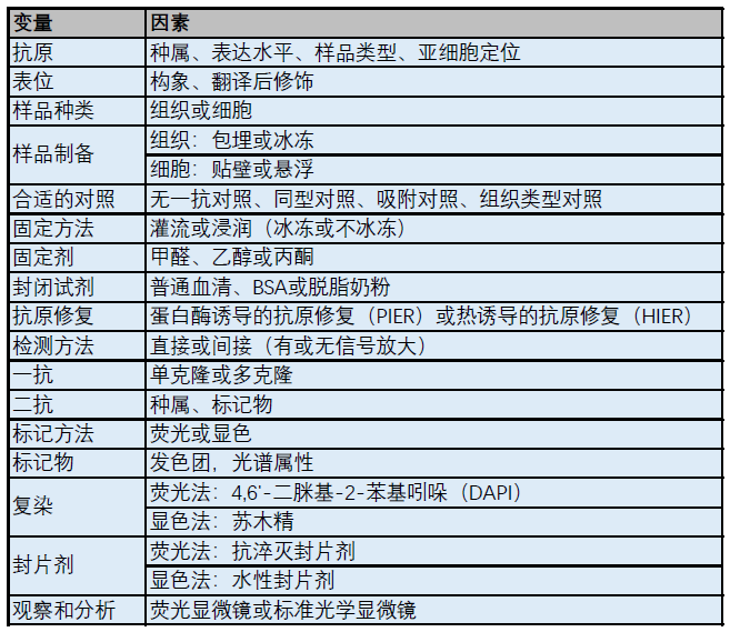 下表列出了影響IHC/ICC的變量和因素,旨在有助于IHC/ICC實(shí)驗的設計、優(yōu)化及疑難的解答。