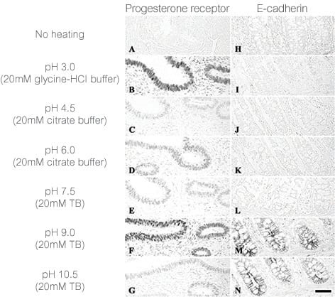 用不同的抗原修復方法暴露表位(用 pH 6 或 pH 9 緩沖液熱修復、酶修復等)。