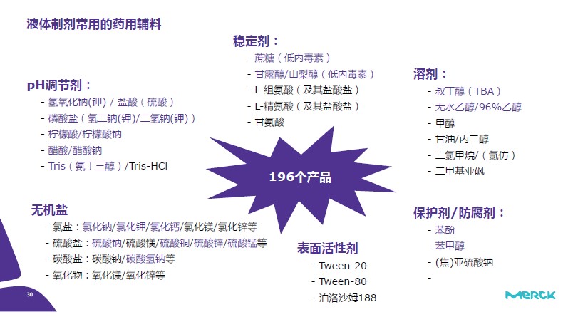 默克的藥用輔料按照應用方向可以分為以下幾類(lèi):固體制劑、液體&半固體制劑、生物醫藥用制劑及一些常用的原料藥產(chǎn)品。下圖列舉了液體制劑中常用藥物輔料產(chǎn)品。