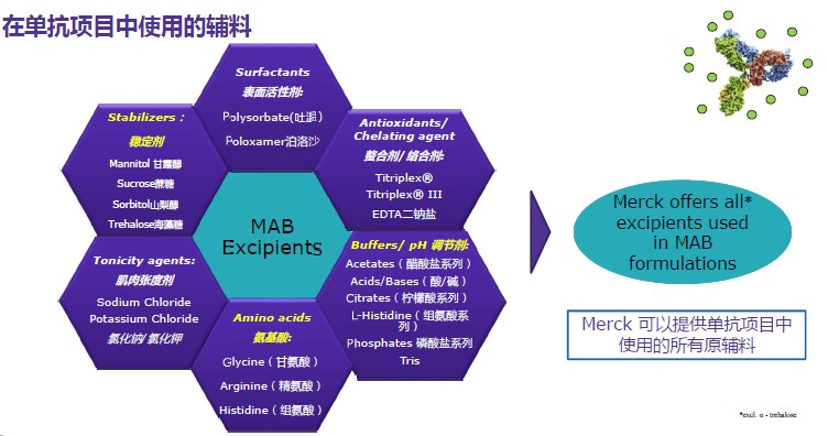 下圖中列舉了在單抗藥物生產(chǎn)中會(huì )用到的各種輔料產(chǎn)品,如:穩定劑、表面活性劑、螯合劑/絡(luò )合劑、PH調節劑、氨基酸和肌肉張度劑等。默克可以提供以上全部過(guò)程中的原輔料產(chǎn)品,為您的單抗藥物開(kāi)發(fā)保駕護航!