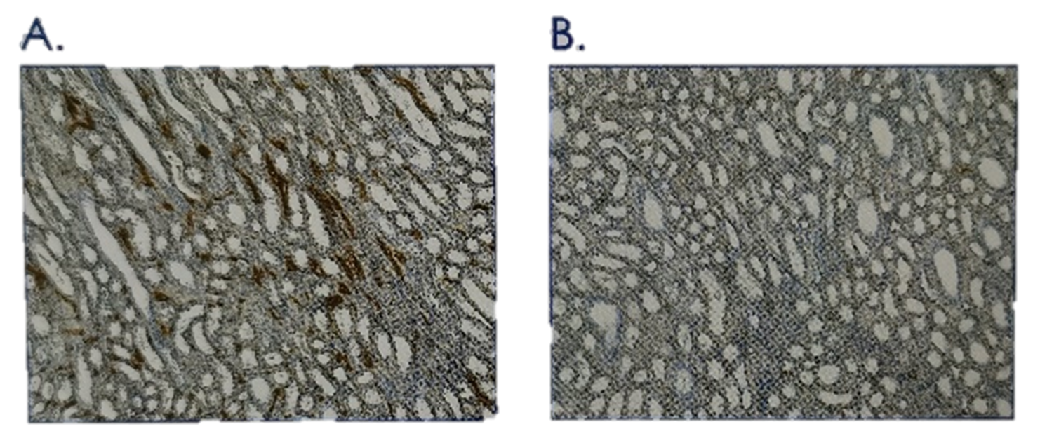 H2O2處理可以清除內源性過(guò)氧化物酶活性。A. 在染色前未清除內源性過(guò)氧化物酶活性的人類(lèi)腎組織切片呈現出假陽(yáng)性信號。組織染色用的是anti- goat HRP-DAB Cell & Tissue Stainingkit(貨號CTs0o8;褐色)。B. 同一組織在染色前于室溫下用3% H2O2的甲醇溶液處理15分鐘,去除內源性過(guò)氧化物酶活性。