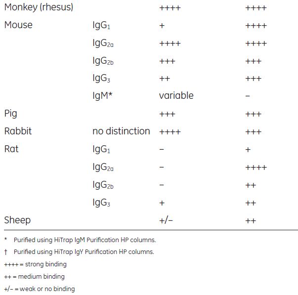 蛋白A和蛋白G對于不同種屬和不同亞型的抗體結合能力差異如下表所示,蛋白A對兔來(lái)源抗體的親和力較高,蛋白G對于小鼠等部分哺乳動(dòng)物抗體的親和力較高。