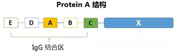 20世紀中期,Jensen發(fā)現有一種蛋白可以與人和兔血清抗體廣泛結合,該蛋白于1964年首次被稱(chēng)為Protein A。 Protein A是一種金黃色葡萄球菌細胞壁蛋白質(zhì),分子量42KD,它能夠特異性地結合多種免疫球蛋白的Fc區段而與Fab區或輕鏈結合很弱。天然的Protein A有5個(gè)IgG結合結構域和未知功能的非Fc結合域,結構示意圖如下: