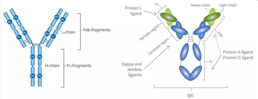 蛋白G來(lái)自于鏈球菌G族的細胞表面蛋白,是III型Fc受體,分子量為25KD,其通過(guò)類(lèi)似于蛋白A的非免疫機制而結合抗體的Fc段,蛋白G與蛋白A均可結合抗體的Fc段,不同的是,蛋白G還能結合Fab段,且蛋白G可以更廣泛的結合更多類(lèi)型的IgG分子,多克隆IgG分子,同時(shí)蛋白G與血清蛋白結合水平低,產(chǎn)物純度高,且配基脫落更低??贵w基本結構和蛋白A/G的結合位點(diǎn)如下圖所示: