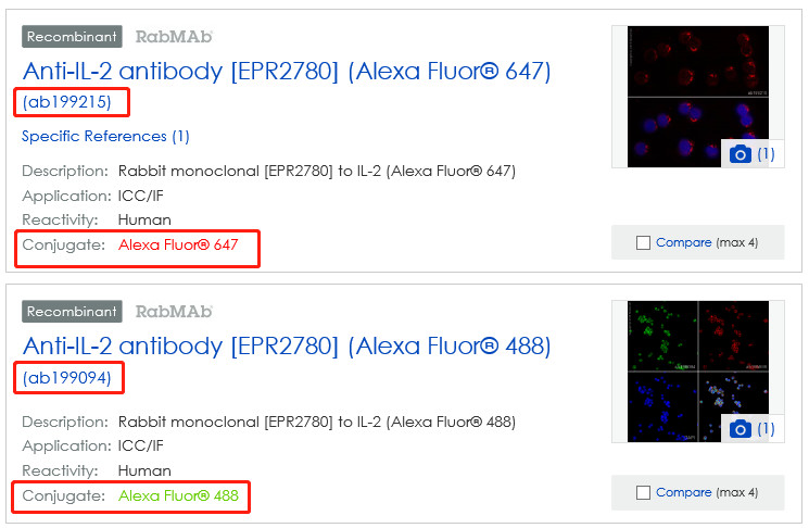 關(guān)于第2點(diǎn),我們舉例進(jìn)行說(shuō)明。如下圖所示,同一克隆號【EPR2780】的IL-2抗體偶聯(lián)了不同的熒光素(AF647和AF488),其抗體貨號不同,是2個(gè)不同的產(chǎn)品。