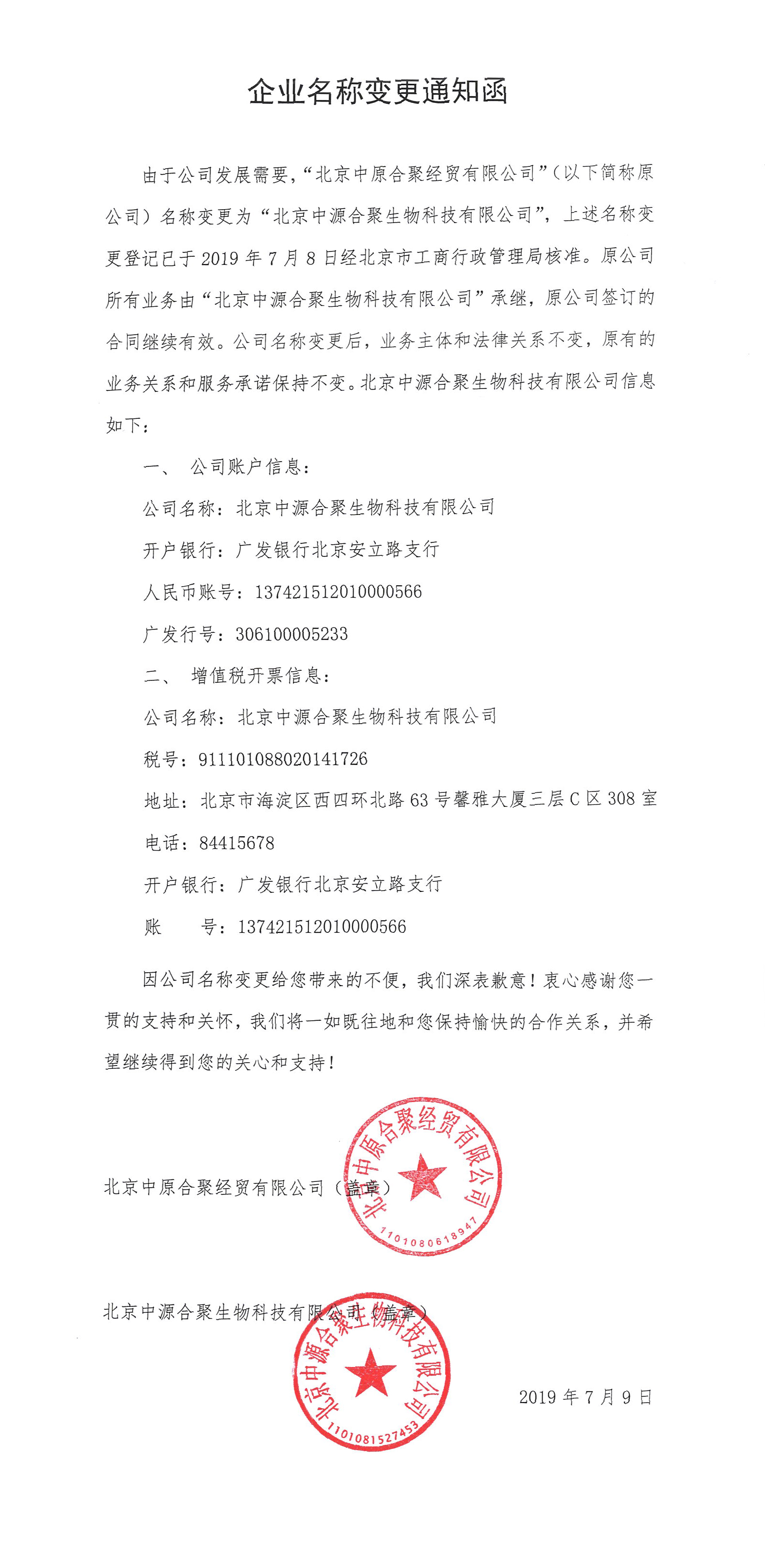 從即日起,原公司所有業(yè)務(wù)由“北京中源合聚生物科技有限公司”繼承,所有對內及對外文件、資料、開(kāi)據發(fā)票,賬號,稅號等全部使用新公司名稱(chēng)。公司更名后,業(yè)務(wù)主體和法律關(guān)系不變,原簽訂的合同繼續有效,原有的業(yè)務(wù)關(guān)系和服務(wù)承諾保持不變。