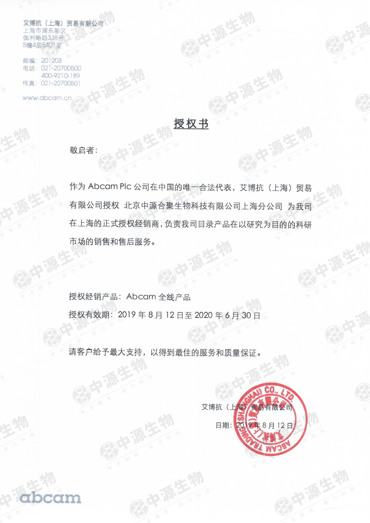 近年來(lái),隨著(zhù)合作的不斷加深,2019年8月起,中源生物在原代理區域(北京、天津、內蒙古、青海、西藏、寧夏)的基礎上新增了Abcam上海地區代理權,我們將一直秉承“專(zhuān)業(yè)服務(wù),助力科技”的宗旨,一如既往的為客戶(hù)帶來(lái)優(yōu)質(zhì)的產(chǎn)品和更好的服務(wù)。