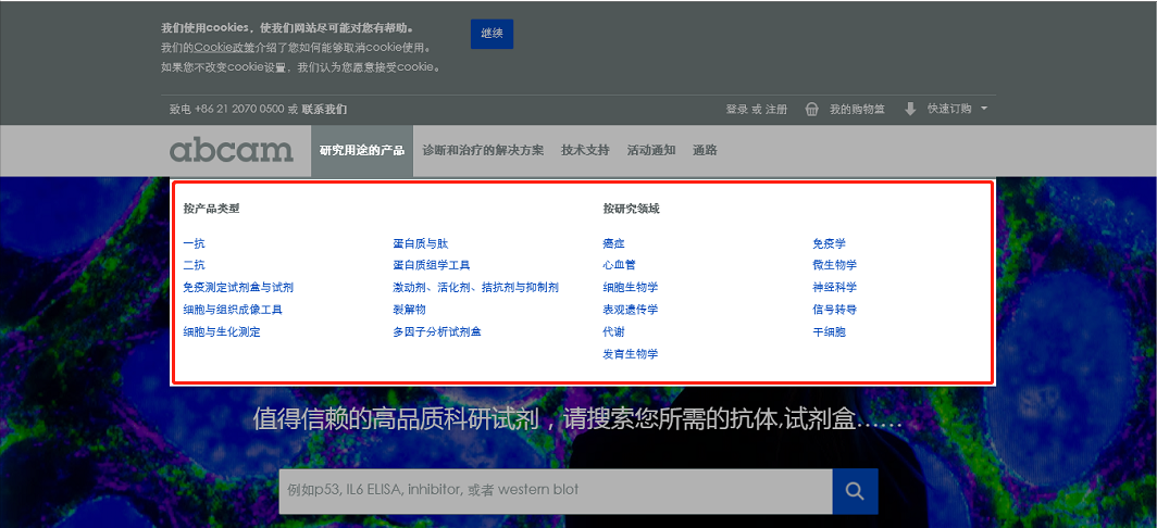 研究領(lǐng)域包括干細胞,神經(jīng)生物學(xué),染色質(zhì)及核信號,心血管,信號轉導,細胞生物學(xué),腫瘤,免疫學(xué),發(fā)育生物學(xué),微生物學(xué)等。公司官網(wǎng)(www.abcam.cn)上有齊全的在線(xiàn)電子目錄,您在數秒內就能找到所需產(chǎn)品。網(wǎng)站獨有的體系,讓您得到的不僅僅是抗體,還有更多服務(wù):