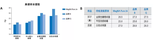 A)糞便是極具挑戰性的樣本,而 MagNA Pure 24系統在4個(gè)待檢測病原中均表現較好。