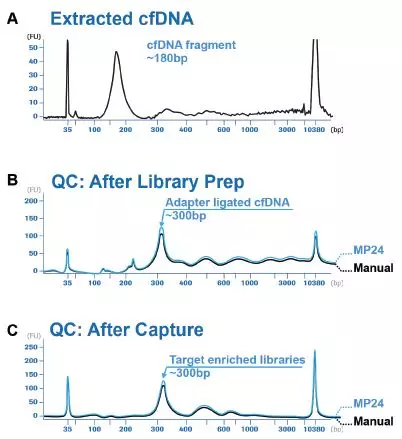 Agilent Bioanalyzer數據展示了采用MagNA Pure 24 Total NA Isolation Kit和MagNA Pure cfNA Buffer Set聯(lián)合使用可更好的對小片段進(jìn)行分離和富集。