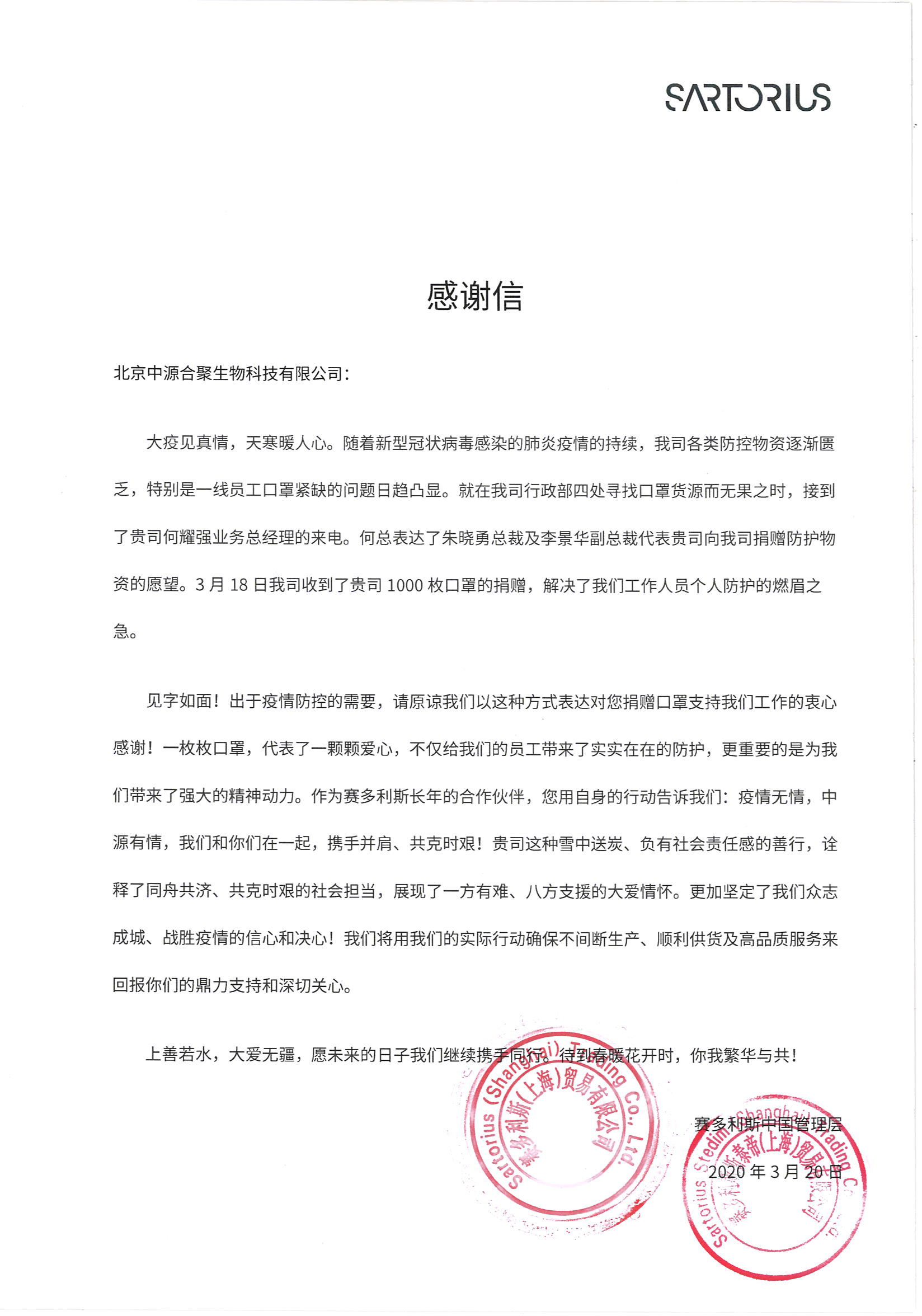 3月18日,正當防疫物資緊缺之際,1000枚口罩送至了賽多利斯的手中。一枚枚來(lái)自中源的口罩,不僅是出于多年合作,更是體現了中源同舟共濟,大愛(ài)之心。
