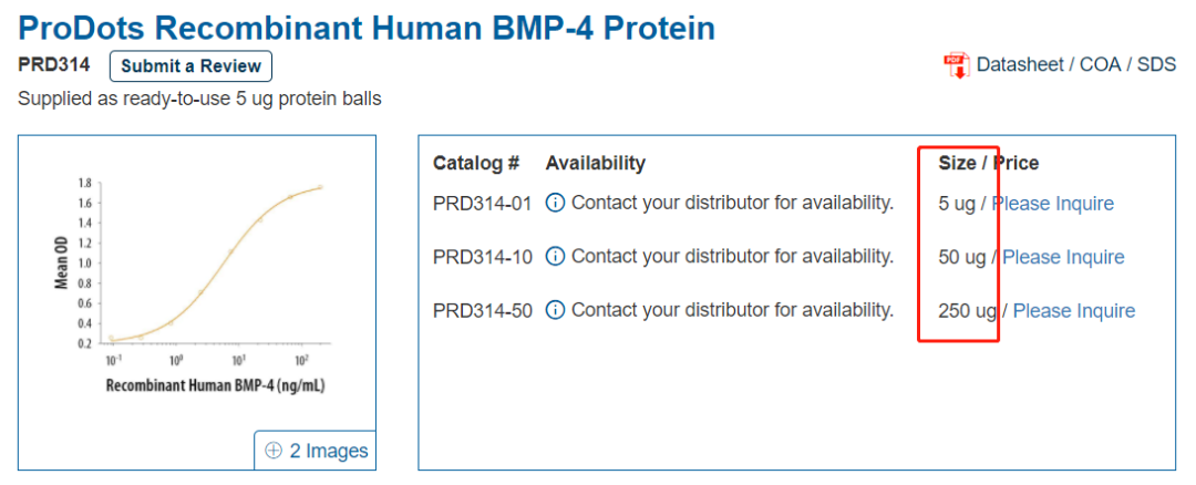 ProDots® 蛋白小球可在培養基中立即溶解,開(kāi)封前 4 ℃ 保存條件下保證 6 個(gè)月的穩定性。多種規格可選,以 ProDots Recombinant Human BMP-4 Protein(貨號 PRD314)為例,有 5 μg、50 μg 和 250 μg 三個(gè)不同的規格,5 μg/顆的獨立包裝,250 μg 包裝有 50 個(gè)獨立小瓶。從而彌補常規包裝的不足,滿(mǎn)足不同研究所需。