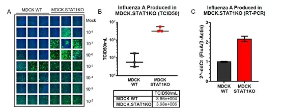 圖1. 甲型流感(H1N1;ATCC®VR-1736™) 接種 STAT1-KO-MDCK 細胞實(shí)驗結果。(A)MDCK WT 親本和 MDCK.STAT1 型 KO 細胞,接種甲型流感,48小時(shí)后收集細胞上清液。綠色-抗流感病毒染色,藍色-核染色。(B)感染甲型流感病毒48小時(shí)后細胞上清液的TCID50值。(C) RT-PCR法定量檢測感染48小時(shí)后甲型流感病毒基因組拷貝數。
