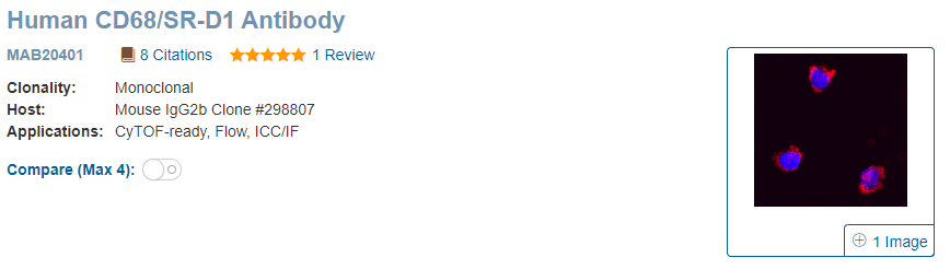 例如,巨噬細胞標志物 CD68(貨號 MAB20401)抗體,應用欄中僅標出了 ICC/IF,雖然不能確定一種抗體在每一種組織中都有同樣的表現,但我們可以證明其對固定抗原的識別,所以也可應用于 IHC 實(shí)驗。