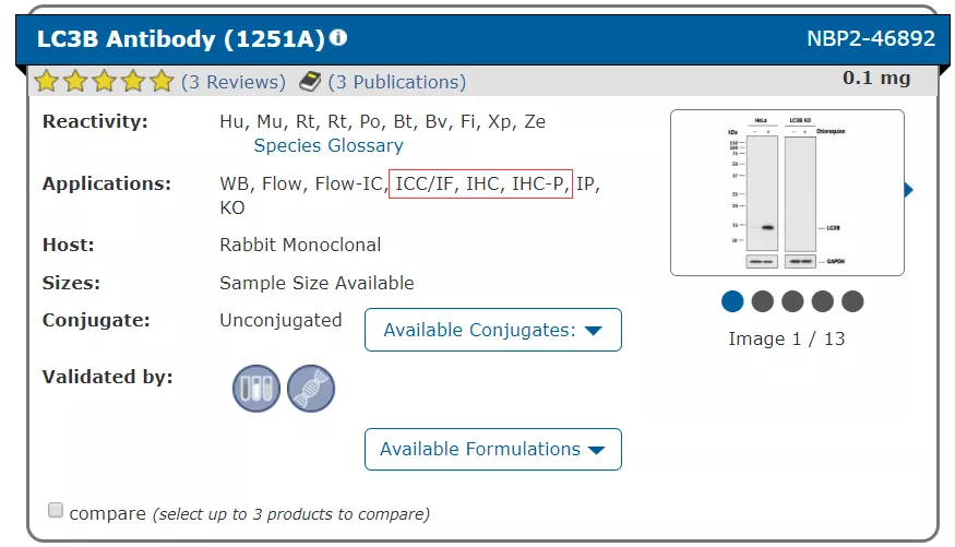 以自噬標志物 LC3B(NBP2-46892)為例,應用欄中標出了 ICC/IF,IHC,IHC-P,說(shuō)明此產(chǎn)品已驗證適用于 ICC/IF 和 IHC-P,未驗證 IHC-Fr 實(shí)驗。