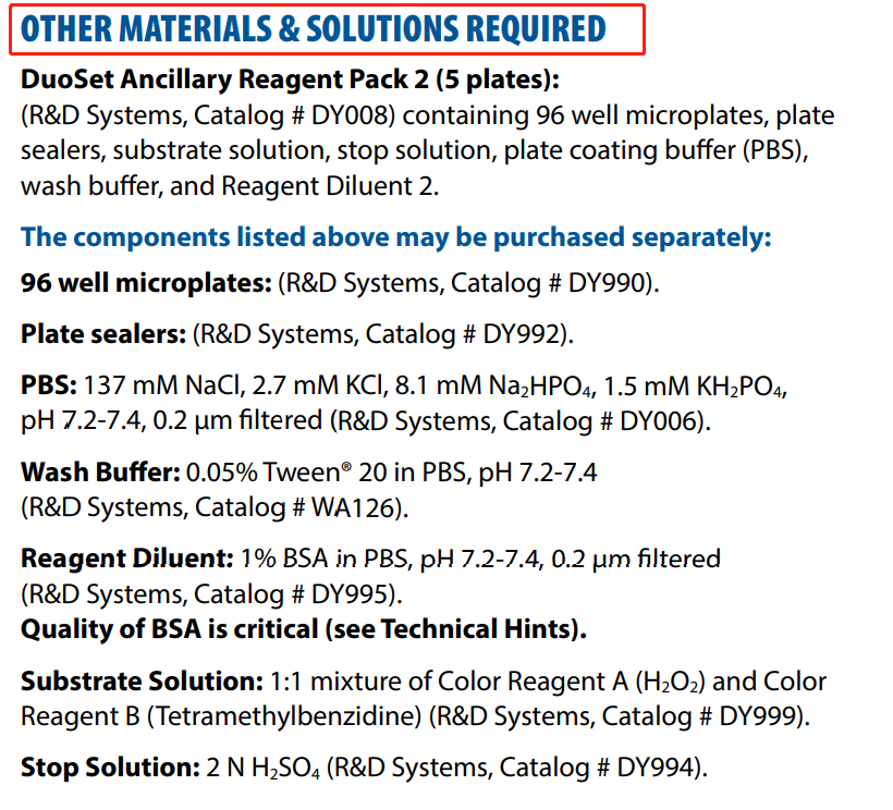 在說(shuō)明書(shū)的「Other Materials & Solutions Required」部分,會(huì )提示需要搭配哪些試劑,產(chǎn)品頁(yè)面也會(huì )給出建議搭配的附屬試劑(請參考下圖)。大部分 DuoSet® ELISA 試劑盒可以直接購買(mǎi)成套的輔助試劑盒,例如 DY007、DY008、DY009 等。