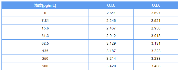 下表中顯示,用戶(hù)使用 cat# DY450:Mouse CCL3/MIP-1 alpha DuoSet ELISA 和自行組配的附屬試劑,得到的標準品 OD 值(450 nm 的測定值減去 570 nm 的測定值)??梢钥吹?,全部標準品 OD 值(包括未加標準品 0 值孔)均出現高的顯色,無(wú)梯度。
