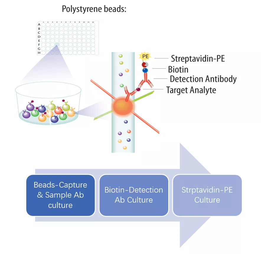 R&D Systems® 擁有 Luminex Assay 以及 Luminex High Performance Assay 兩個(gè)產(chǎn)品系列,均基于帶有顏色編碼的微球,這些微球表面包被了識別不同目標分析物的特異性抗體。當預包被的微球與待檢樣本孵育時(shí),分析物被微球捕獲,經(jīng)由生物素標記的特異性檢測抗體混合物識別,加入鏈霉親和素 - PE 熒光素底物后發(fā)光并進(jìn)行定量檢測。