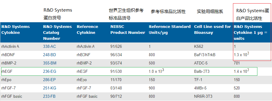 比如人 EGF 蛋白產(chǎn)品(貨號 236-EG),1 μg=1.4*103 U,如果文獻中所用的濃度為 100 U/mL,換算到該產(chǎn)品的質(zhì)量濃度就是 100/1400=0.07 μg/mL。