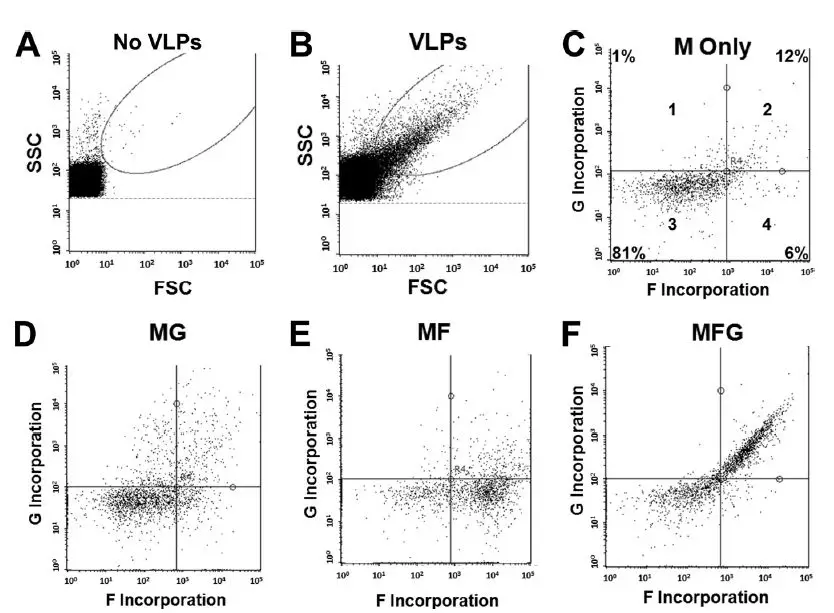 作者利用Guava 8HT檢測發(fā)現,相較于下圖A中PBS緩沖液,圖B中VLPS病毒FSC/SSC信號可以很好的與背景分開(kāi)。圖C-F顯示分別連接了1種、2種和3種不同病毒糖蛋白片段后VLPs在四象限門(mén)內的表達變化。