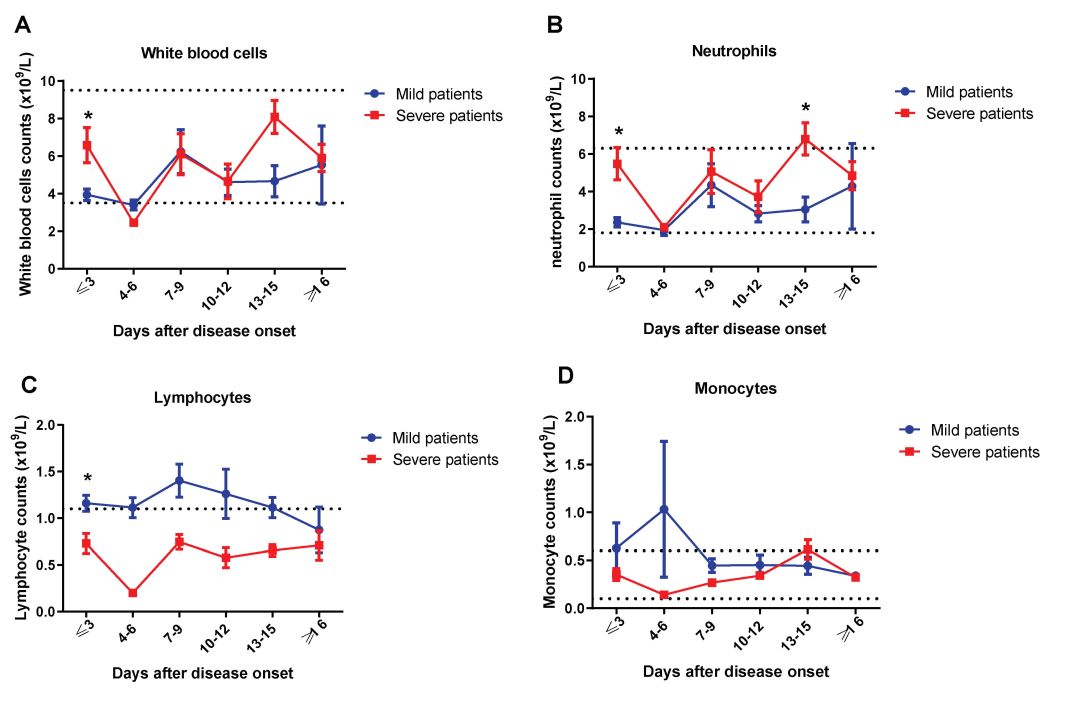 1. 重癥患者入院時(shí)外周血淋巴細胞的絕對計數顯著(zhù)低于輕癥患者,而白細胞和中性粒細胞的絕對計數明顯高于入院時(shí)的輕癥患者(下圖)。
