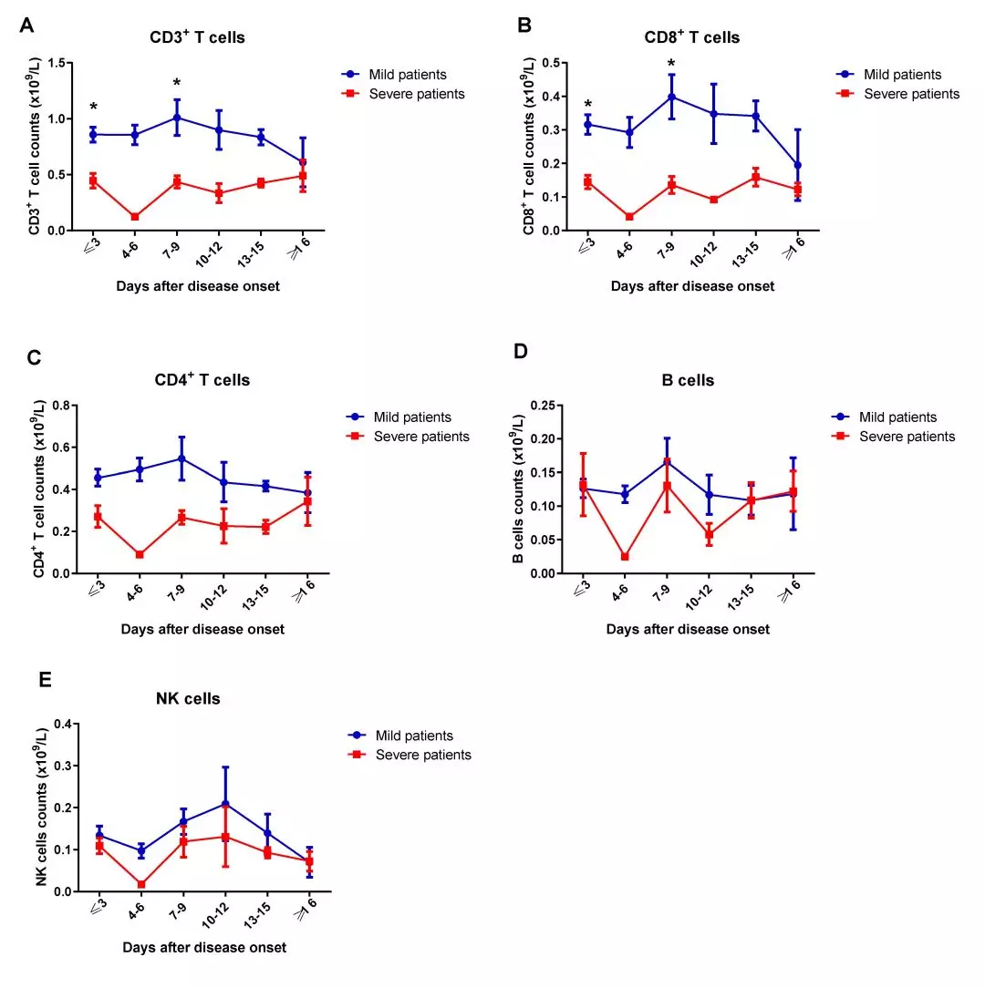 2. 與輕癥患者相比,重癥患者CD3+ T細胞、CD4+和CD8+T細胞亞群計數持續下降,而B(niǎo)細胞和NK細胞計數無(wú)顯著(zhù)性差異(下圖)。