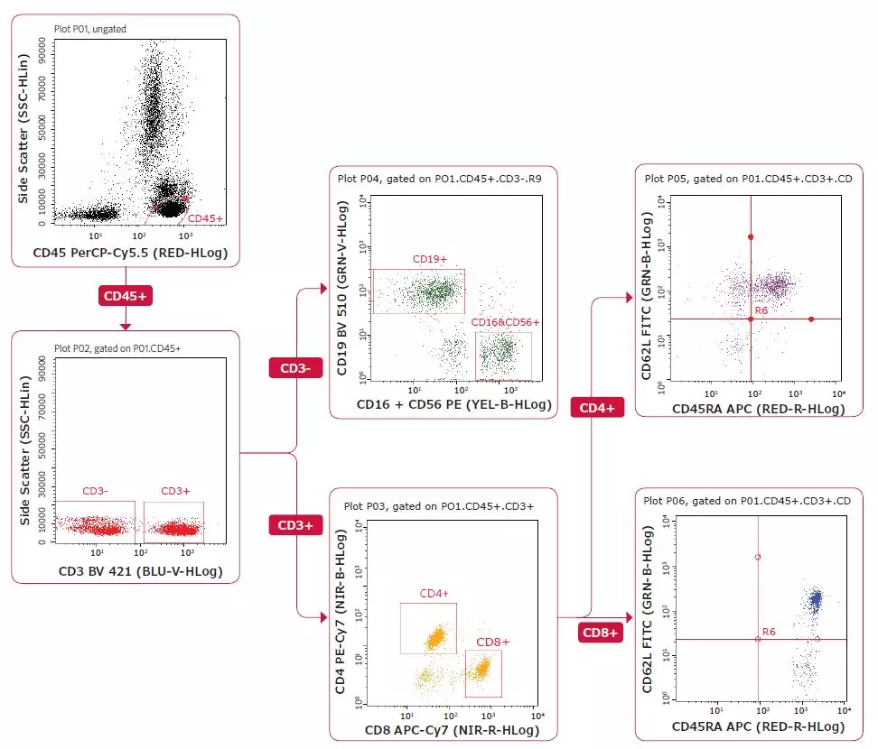 取10 μl 成人全血,與抗CD45,CD3,CD4,CD8,CD16,CD56,CD19,CD45 RA和CD62L抗體混合,室溫孵育20分鐘;