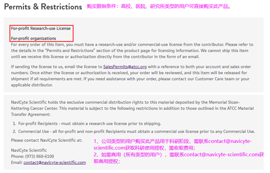 訂購某些ATCC產(chǎn)品時(shí),有特殊的限制條件,這部分信息可以在產(chǎn)品詳情頁(yè)的Permits & Restrictions部分查看。