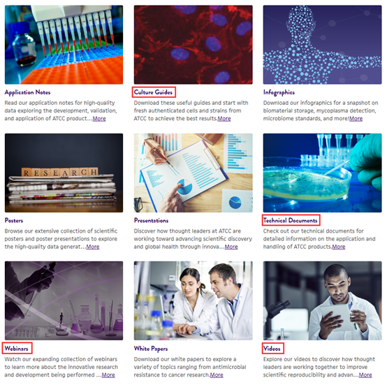 或直接通過(guò):https://www.atcc.org/resources進(jìn)入學(xué)習中心。1)進(jìn)入“Culture Guides”中心(https://www.atcc.org/resources/culture-guides),可獲取ATCC各類(lèi)產(chǎn)品的培養指南;