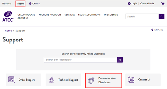 打開(kāi)ATCC官網(wǎng),點(diǎn)擊Support,然后點(diǎn)擊“Determine Your Distributor”。