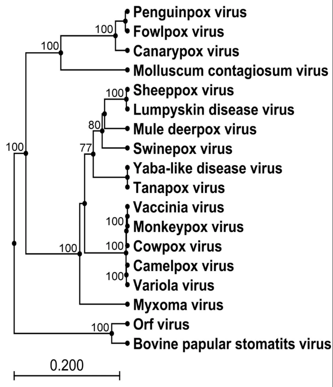 猴痘病毒進(jìn)化樹(shù),From: Phylogenetic analysis of three genes of Penguinpox virus corresponding to Vaccinia virus G8R (VLTF-1), A3L (P4b) and H3L reveals that it is most closely related to Turkeypox virus, Ostrichpox virus and Pigeonpox virus
