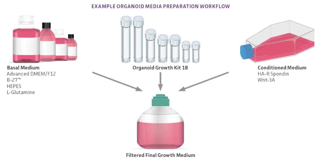 ATCC 類(lèi)器官kit產(chǎn)品讓制備類(lèi)器官生長(cháng)培養基變得簡(jiǎn)單。要使用類(lèi)器官試劑盒,你只需向試劑盒中包含的小瓶中添加適當體積的基礎培養基,并充分混合即可。用移液管將重組試劑盒成分移到基礎培養基中,并添加適當體積的條件培養基。將這種混合物通過(guò)一個(gè)瓶蓋過(guò)濾裝置,就可以培養你的類(lèi)器官啦!