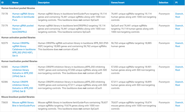以下是目前可以提供的CRISPR libraries研究相關(guān)慢病毒對應的質(zhì)粒,點(diǎn)擊“Name”列即可進(jìn)入質(zhì)粒對應的慢病毒產(chǎn)品頁(yè)面,從而可以查詢(xún)慢病毒產(chǎn)品的價(jià)格、體積、滴度、運輸形式、儲存溫度等信息。