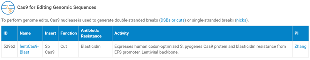 以下是目前可以提供的Cas9蛋白研究相關(guān)慢病毒對應的質(zhì)粒,點(diǎn)擊“Name”列即可進(jìn)入質(zhì)粒對應的慢病毒產(chǎn)品頁(yè)面,從而可以查詢(xún)慢病毒產(chǎn)品的價(jià)格、體積、滴度、運輸形式、儲存溫度等信息。