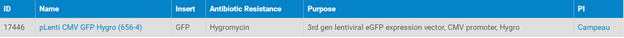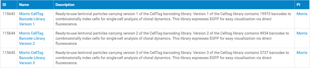 以下是目前可以提供的Barcoding Libraries研究相關(guān)慢病毒對應的質(zhì)粒,點(diǎn)擊“Name”列即可進(jìn)入質(zhì)粒對應的慢病毒產(chǎn)品頁(yè)面,從而可以查詢(xún)慢病毒產(chǎn)品的價(jià)格、體積、滴度、運輸形式、儲存溫度等信息。
