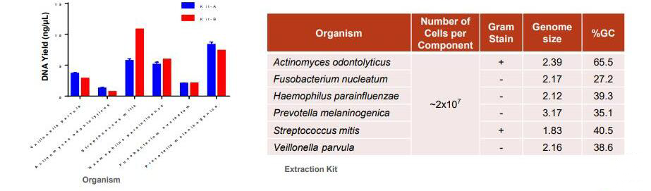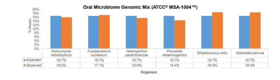 ATCC通過(guò)使用兩種商業(yè)化核酸提取試劑盒對口腔拭子標準品分別做提取實(shí)驗(圖2),與預期結果做對比以此來(lái)優(yōu)化核酸提取方法。(口腔拭子基因組標準品ATCC® MSA-1004™和口腔拭子全菌株標準品ATCC® MSA-2004™,均為通過(guò)細胞計數等量分配菌株或經(jīng)熒光定量后等量分配基因組拷貝數產(chǎn)品。)